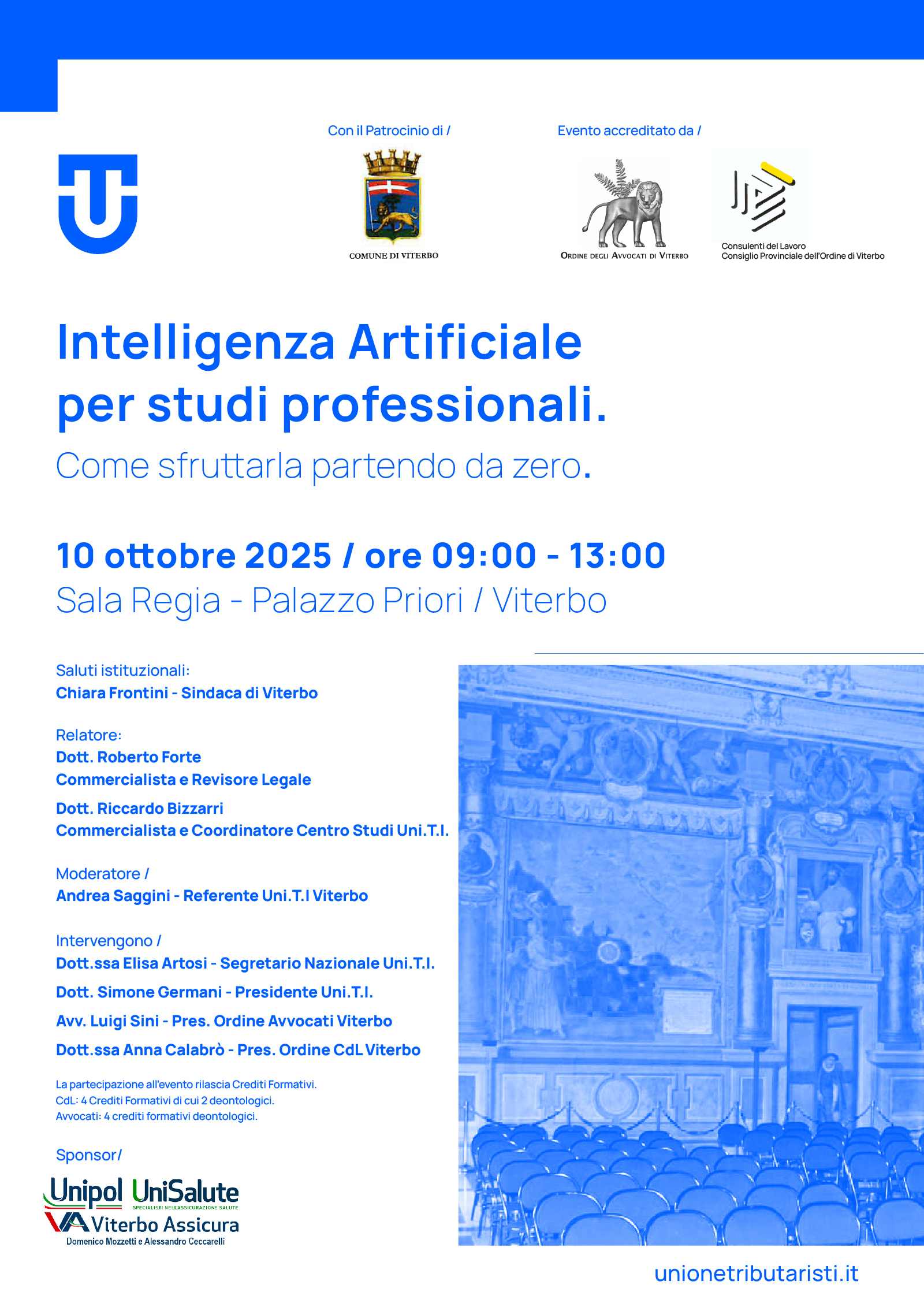L’Unione Tributaristi Italiani organizza un evento formativo gratuito il 10 ottobre 2025, dalle 9:00 alle 13:00, presso la prestigiosa Sala Regia di Palazzo Priori a Viterbo, dedicato all’applicazione concreta dell’intelligenza artificiale all’interno degli studi professionali.