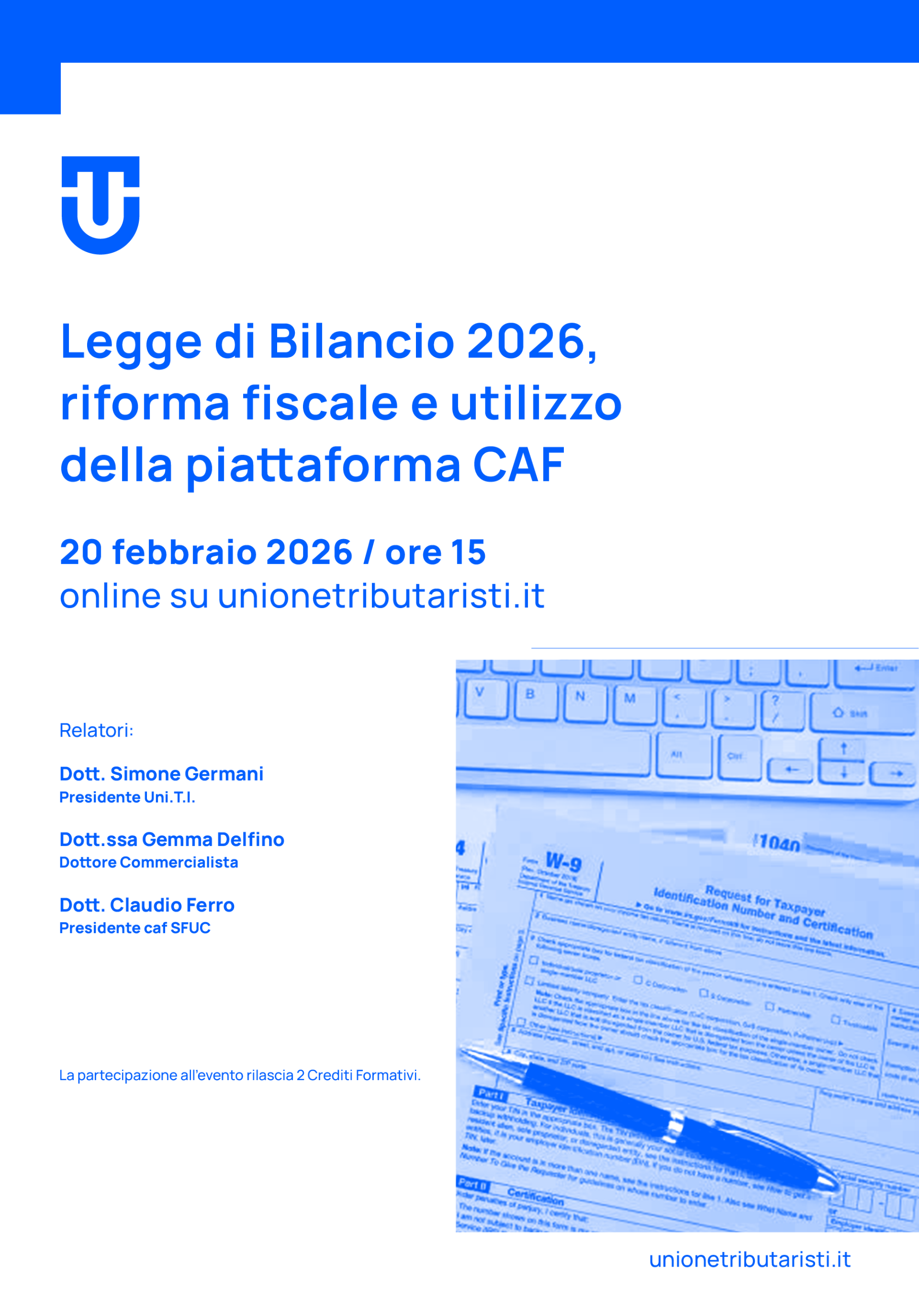 Il 20 febbraio 2026 Uni.T.I. propone un webinar in diretta per fare il punto sulle novità introdotte dalla Legge di Bilancio 2026 e dagli interventi della riforma fiscale attualmente in vigore.