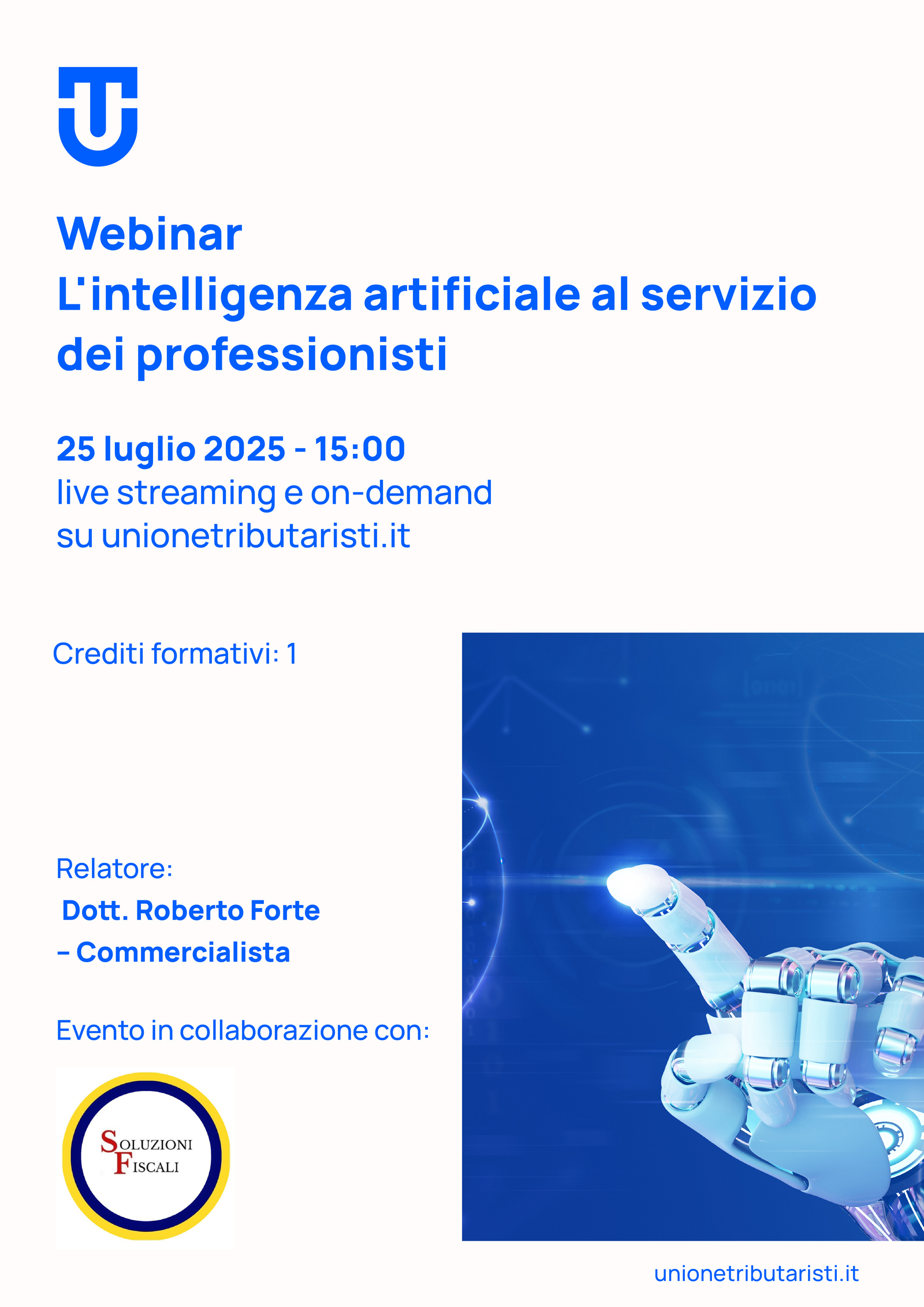 L’Unione dei Tributaristi Italiani (Uni.T.I.), in collaborazione con Soluzioni Fiscali, invita i propri associati a partecipare al webinar “L’intelligenza artificiale al servizio dei professionisti”, in programma venerdì 25 luglio 2025 alle ore 15:00 in live streaming e disponibile successivamente on-demand su unionetributaristi.it.